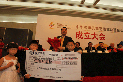中華少年兒童慈善救助基金會(以下簡稱“兒慈會”)2010年1月12日在北京人民大會堂正式成立。中共中央政治局常委、國務(wù)院副總理李克強(qiáng)在為基金會成立發(fā)來的賀信中說:“慈善救助是一項崇高的事業(yè),是對社會保障的重要補(bǔ)充。謹(jǐn)對基金會的成立表示祝賀,對大家矢志從事少年兒童事業(yè)表示由衷的敬意。希望并相信你們會在各方支持下,發(fā)揮優(yōu)勢,搭建平臺,幫助更多有特殊困難的少年兒童和他們的同齡人,一起在同一片藍(lán)天下健康成長。”江西省建設(shè)工程有限公司董事長宗贛生到會并捐贈人民幣500萬元設(shè)立"自立奮進(jìn)獎",宗贛生表示,以后會根據(jù)企業(yè)發(fā)展?fàn)顩r捐款額逐年遞增,對貧困學(xué)生以及教師進(jìn)行資助和獎勵。